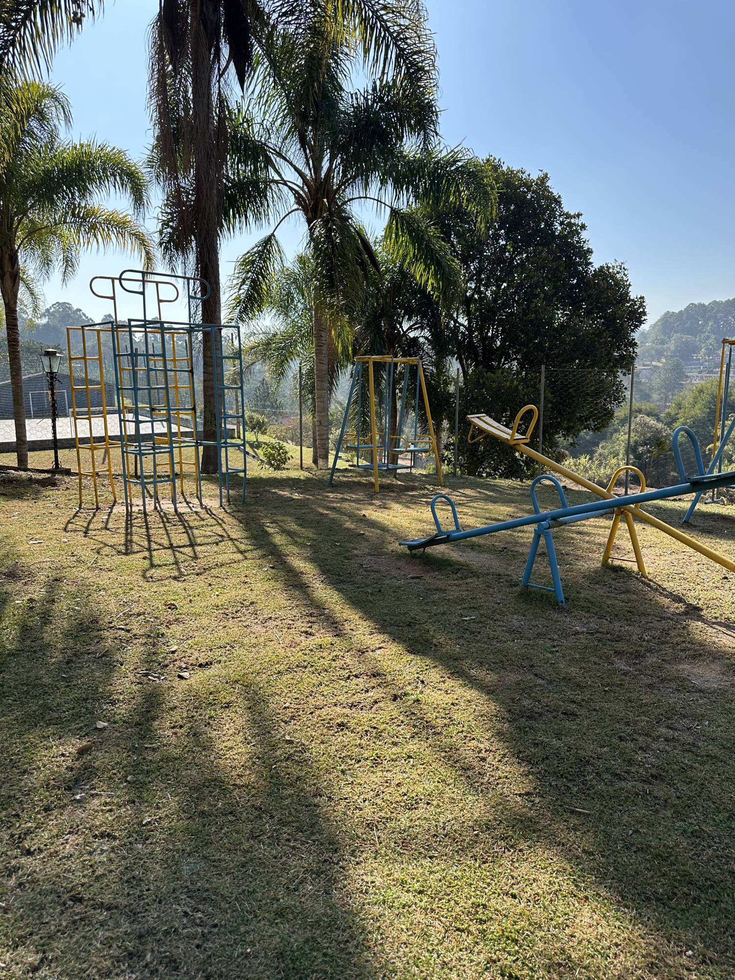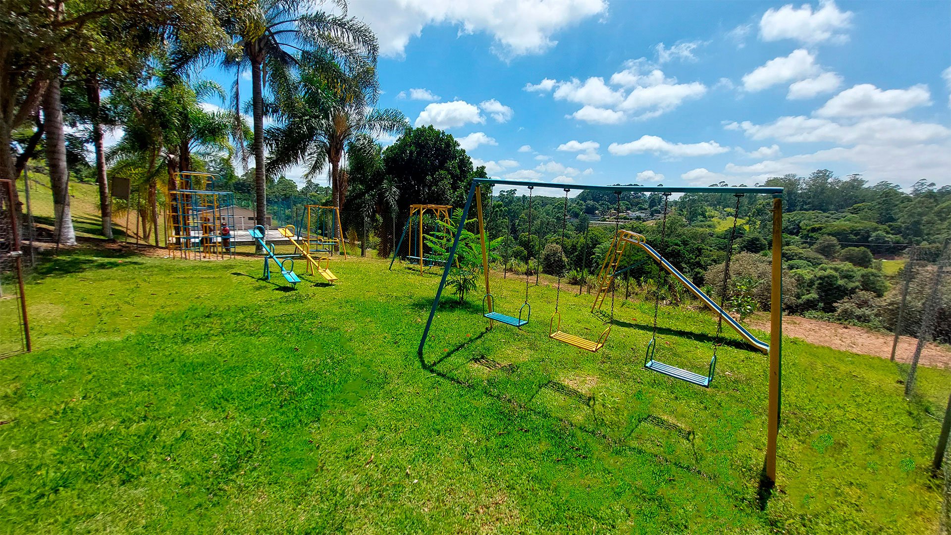 Área destinada às crianças de até 10 anos contendo balanço individual, gangorra, escorregador, balanço duplo e gaiola labirinto.
