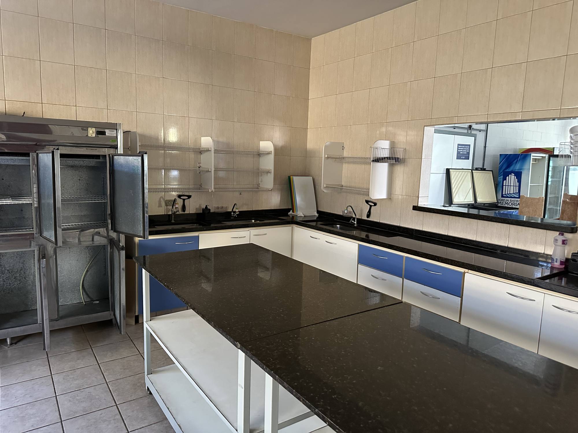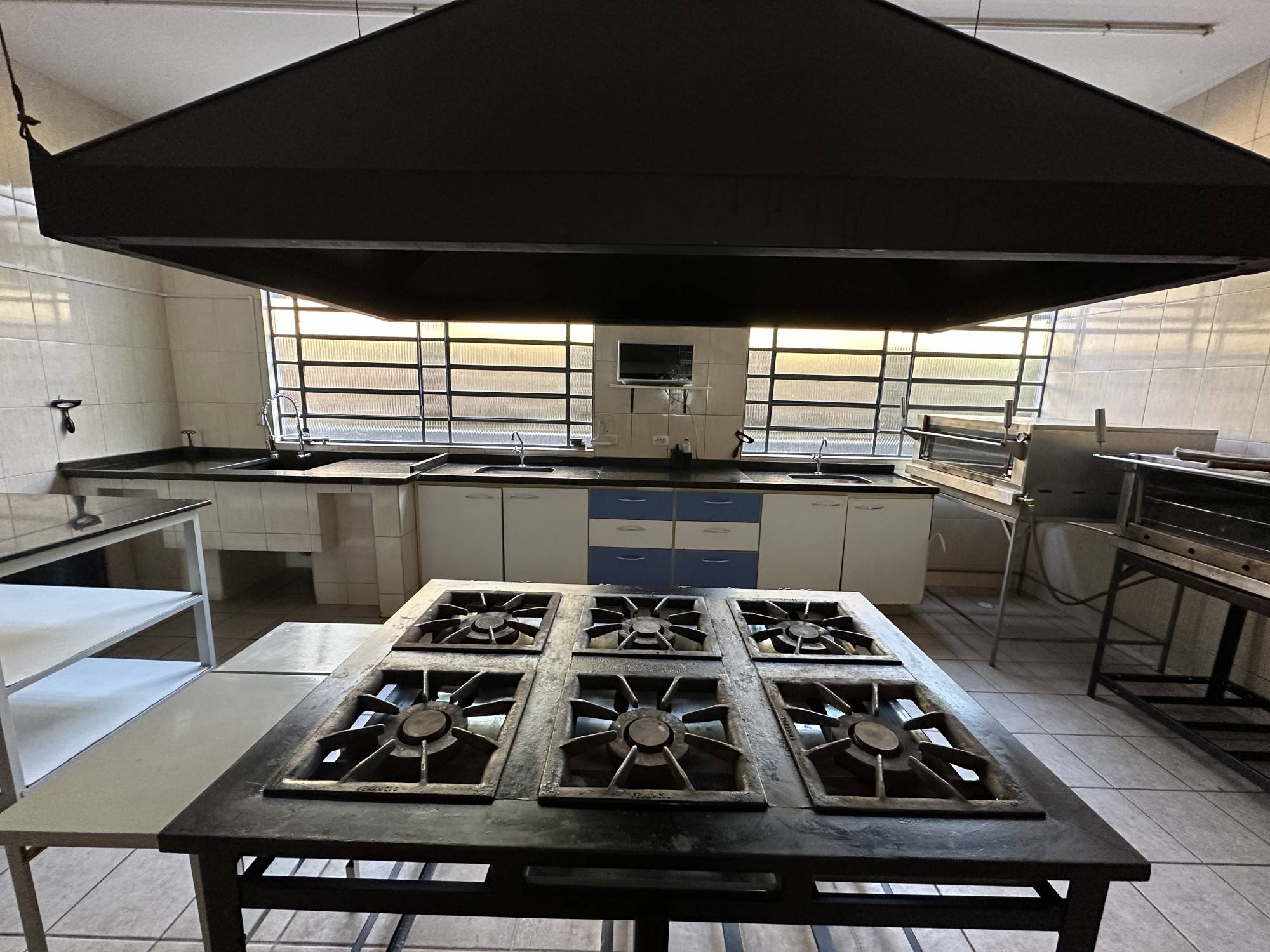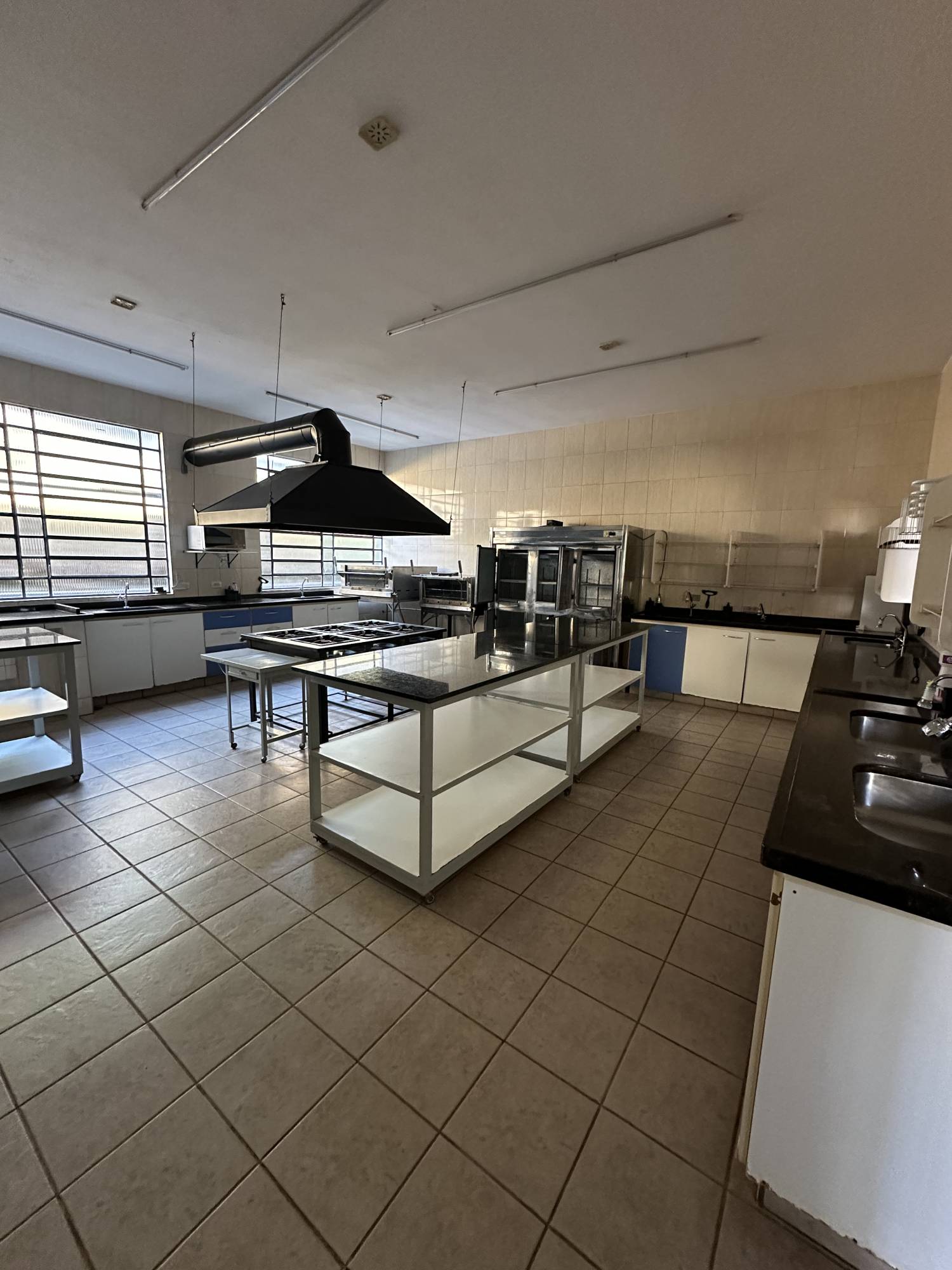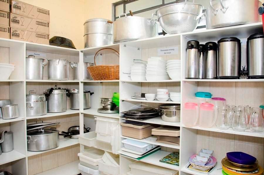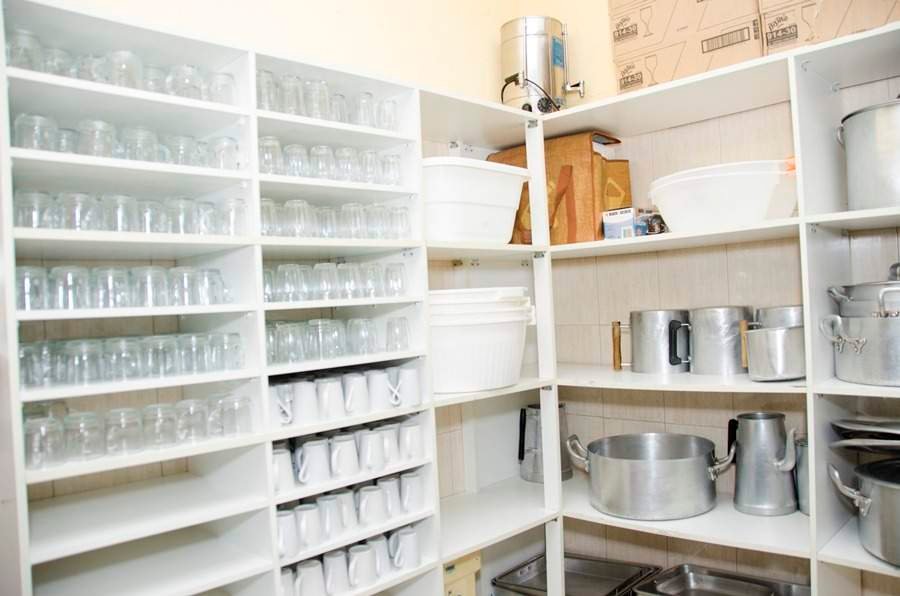Ampla cozinha industrial para 20 pessoas trabalharem e dispensa equipada com os utensílios necessários para realização do evento, oito cubas para lavar as louças, e bancadas para manipulação dos alimentos.
