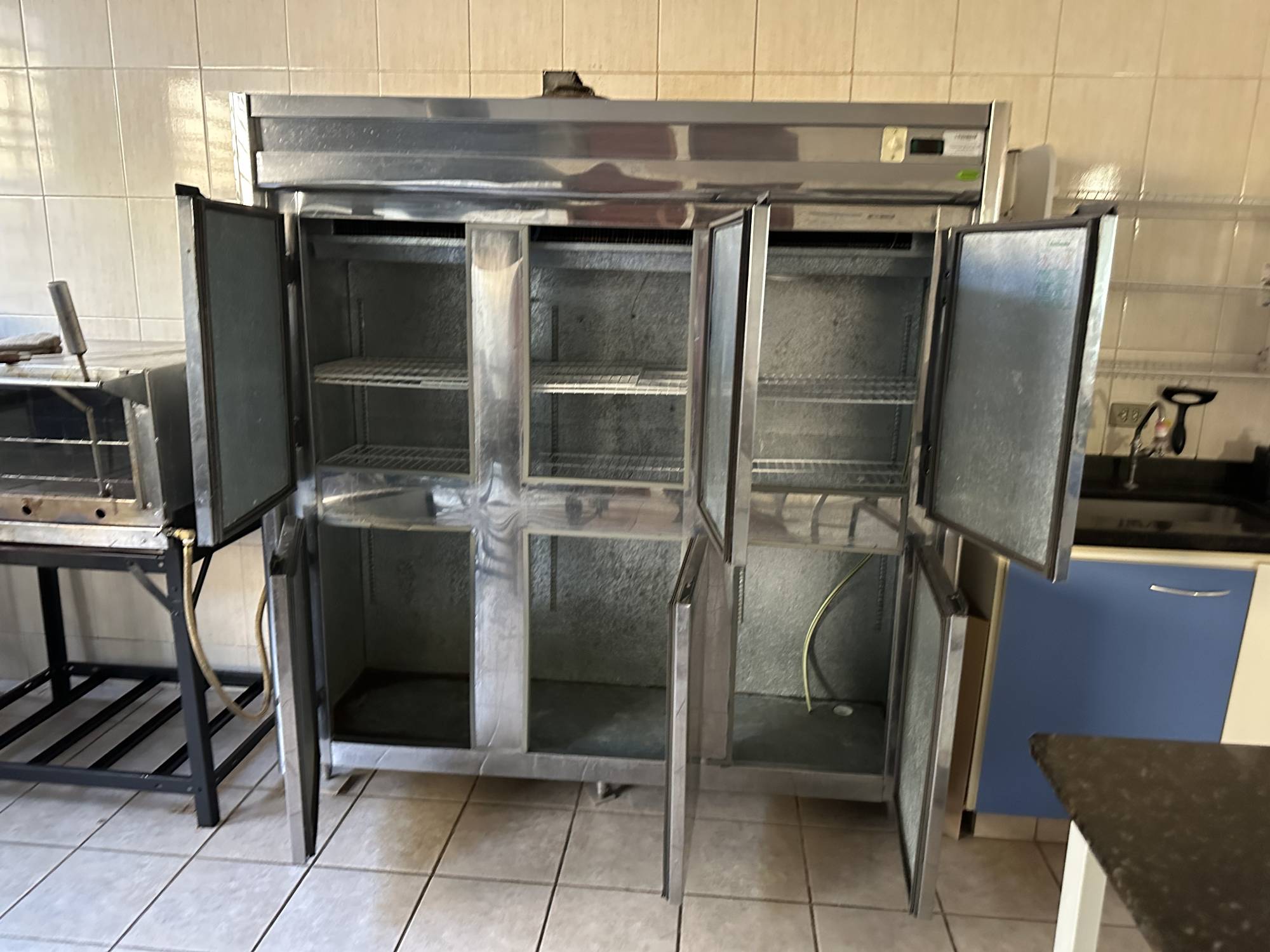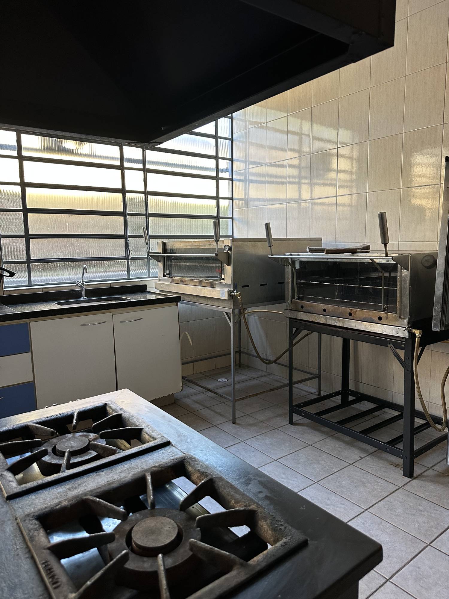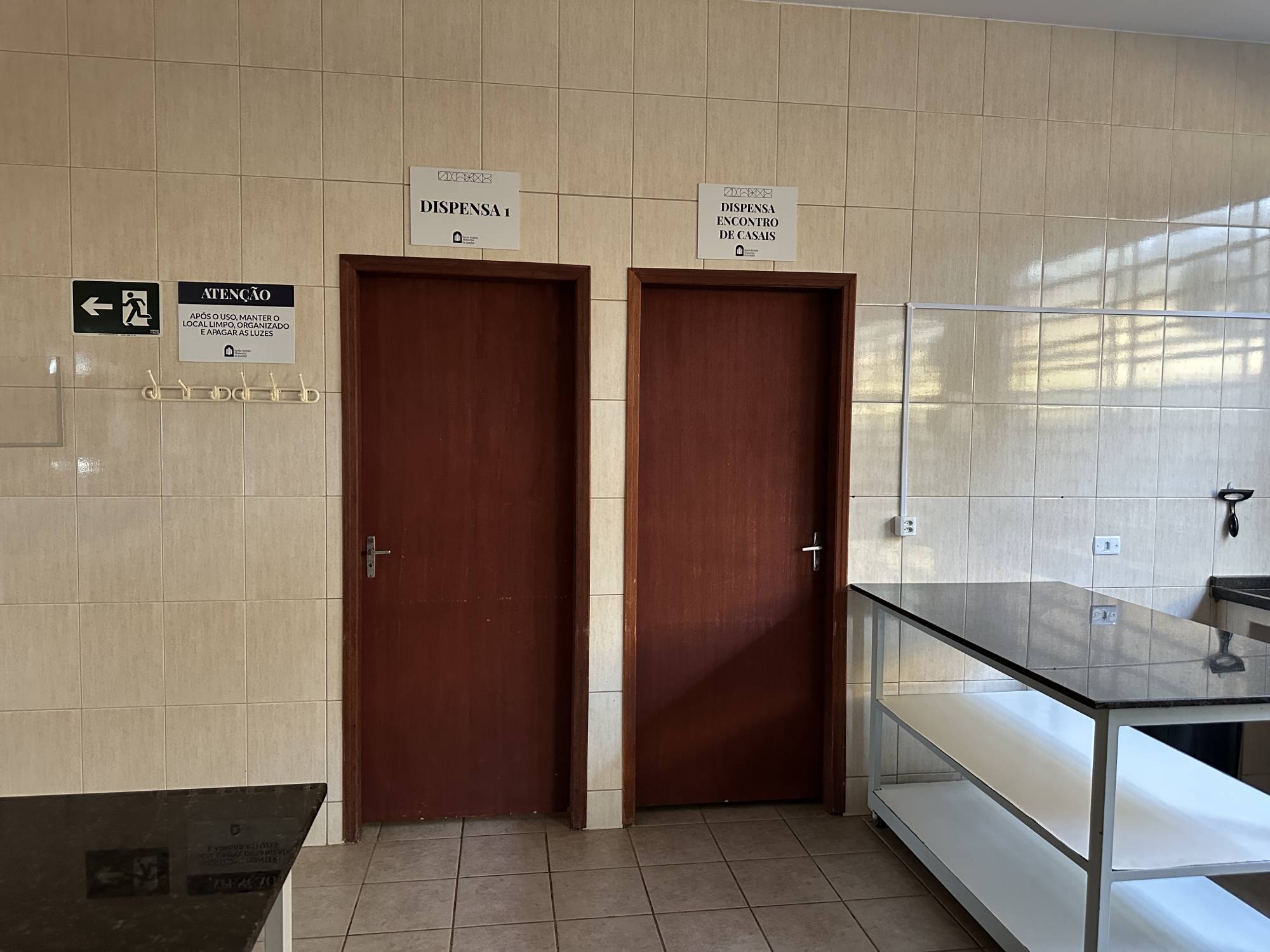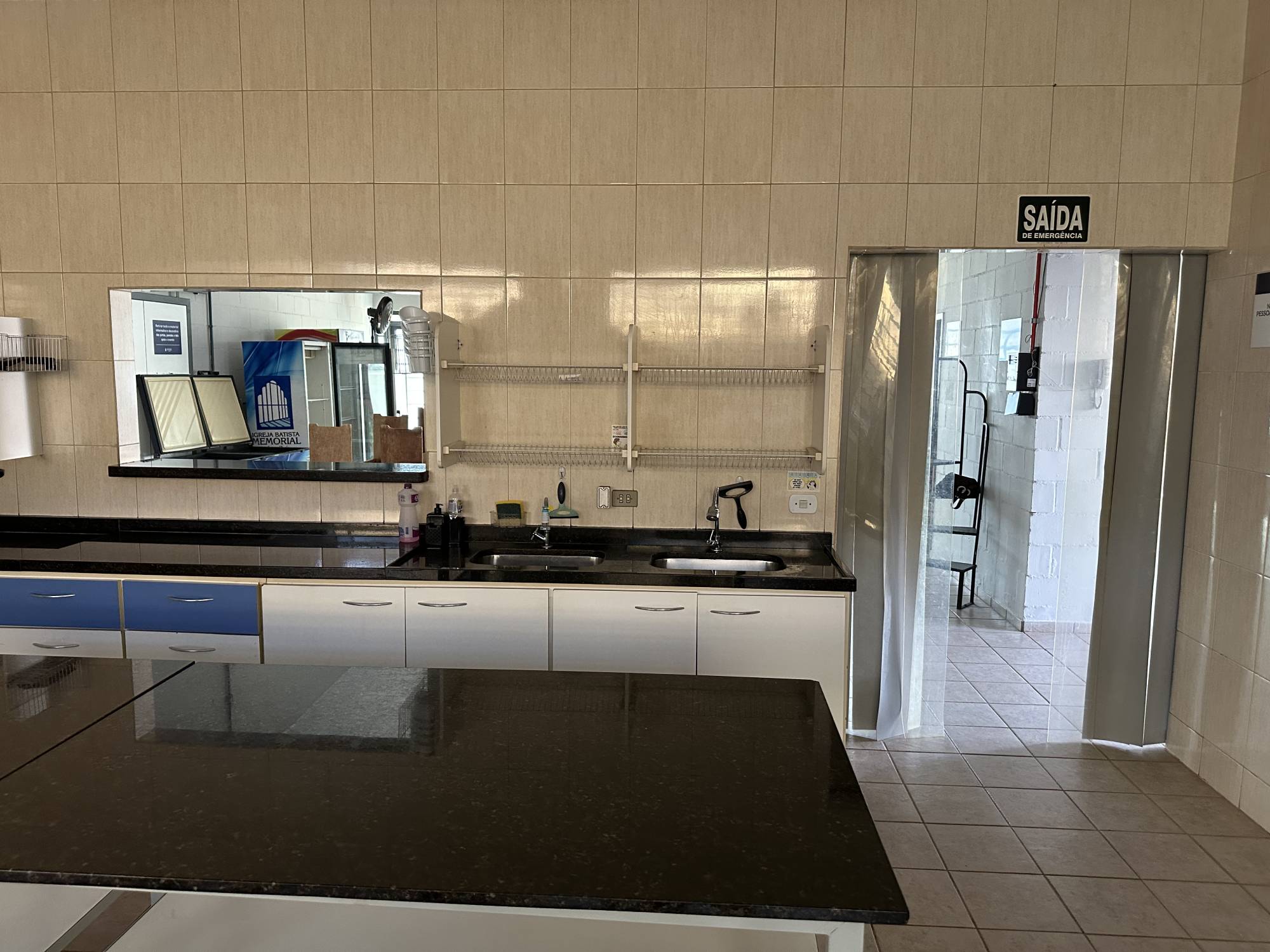 Ampla cozinha industrial para 20 pessoas trabalharem e dispensa equipada com os utensílios necessários para realização do evento, oito cubas para lavar as louças, e bancadas para manipulação dos alimentos.