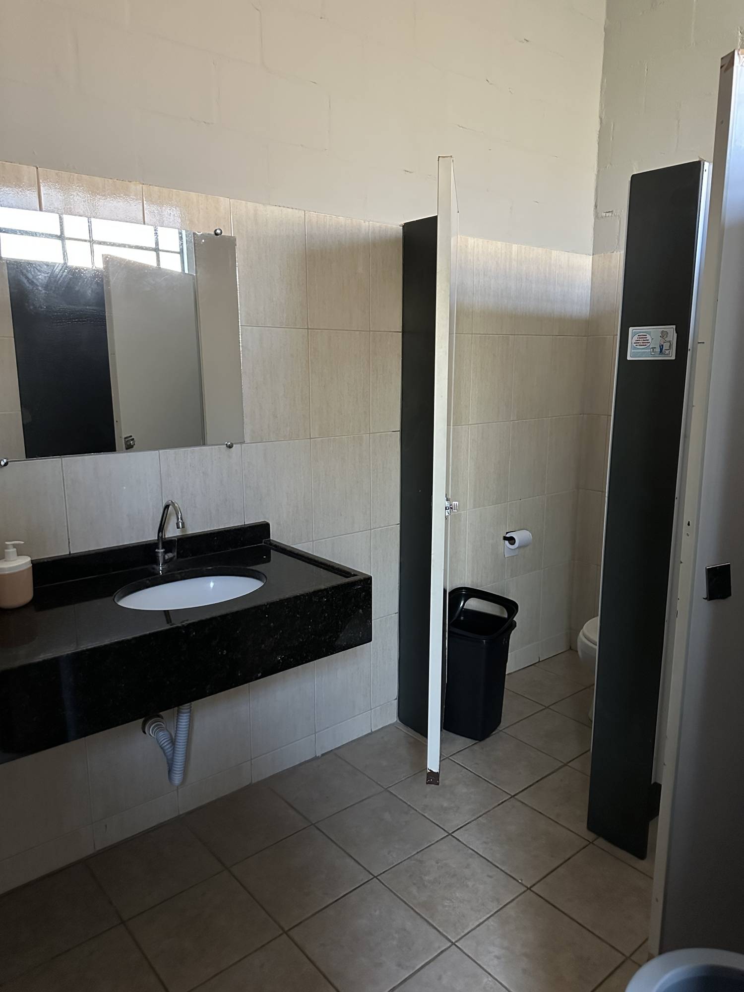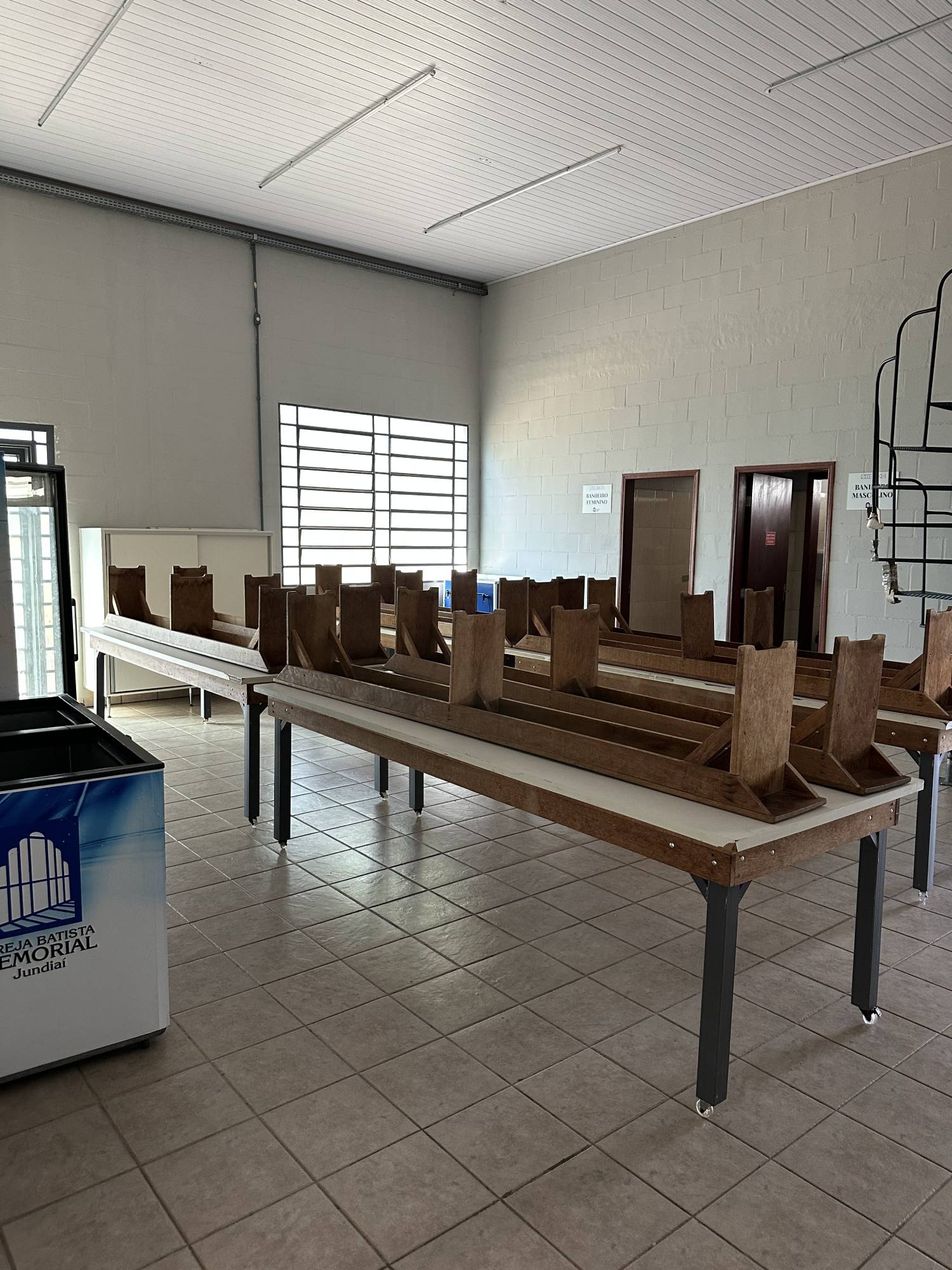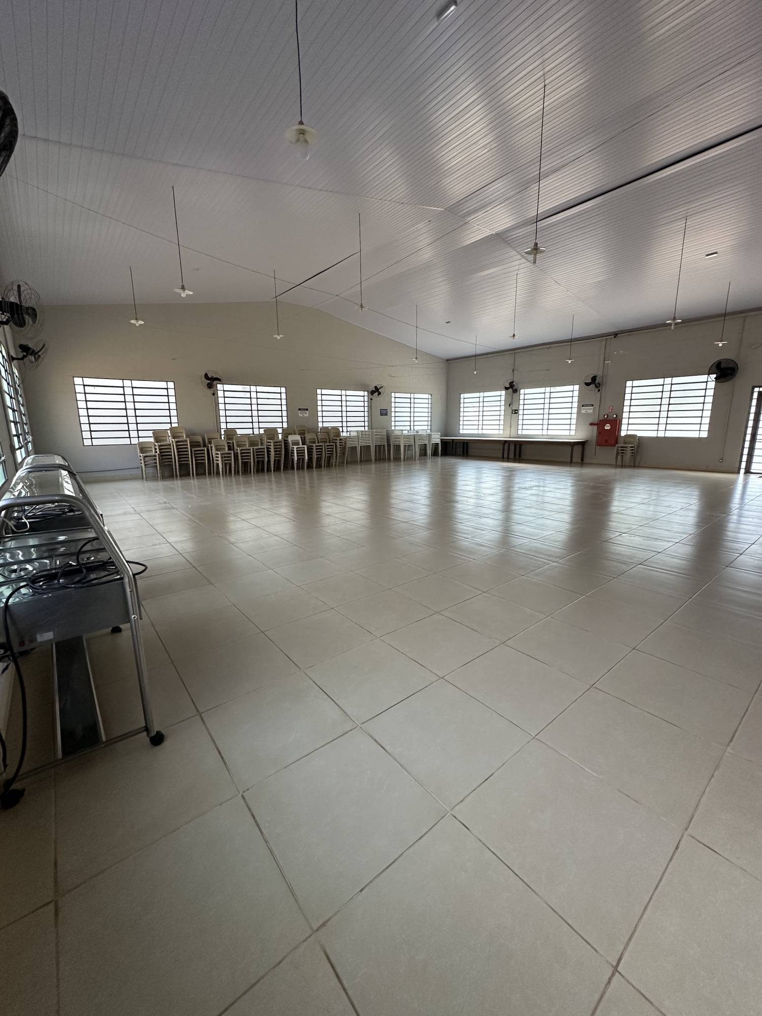 Refeitório arejado, com ventiladores e com capacidade para 350 pessoas. Contém: dois richôs, mesas, cadeiras, mesas de apoio e dois banheiros: masculino e feminino.