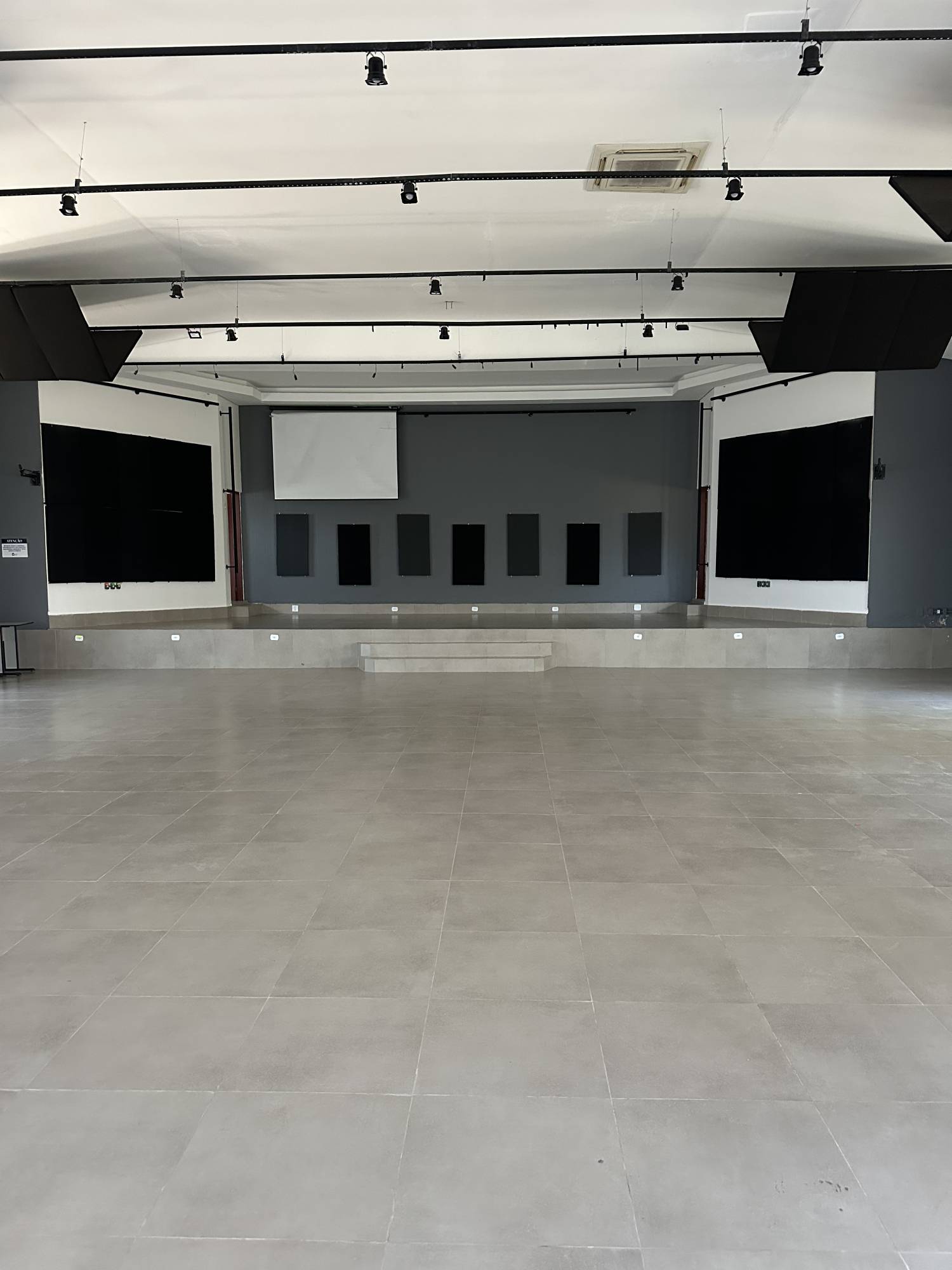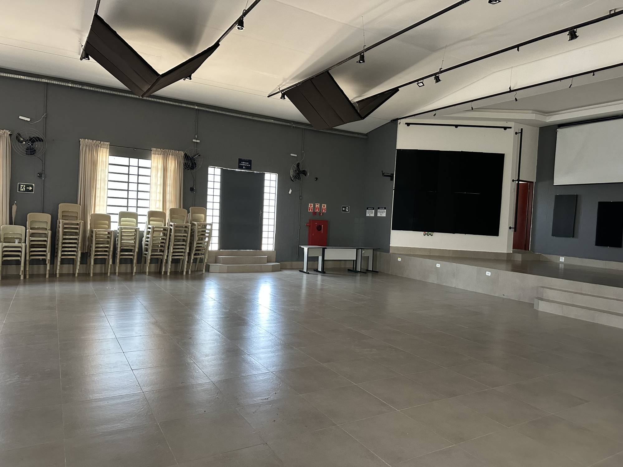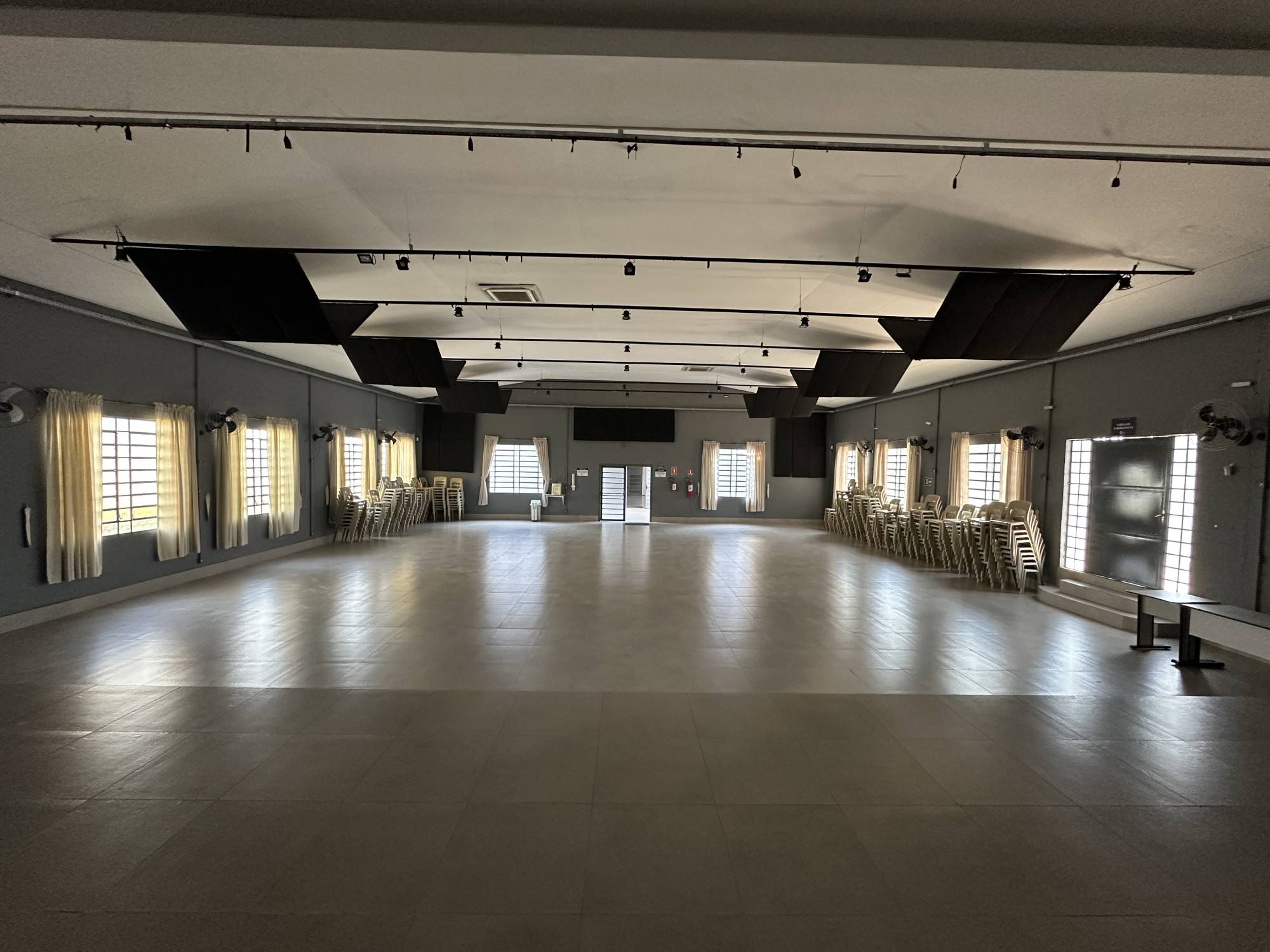 Com duas salas de apoio, ar condicionado, ventiladores, instalações para som e multimídia adaptável para várias atividades.
