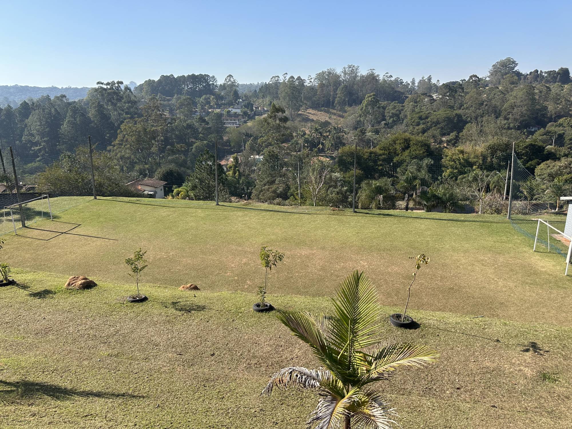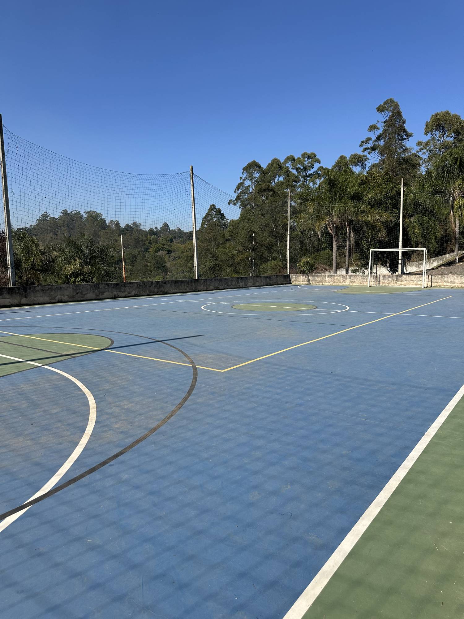 Campo gramado para futebol society e quadra poliesportiva com vestiários masculino e feminino.