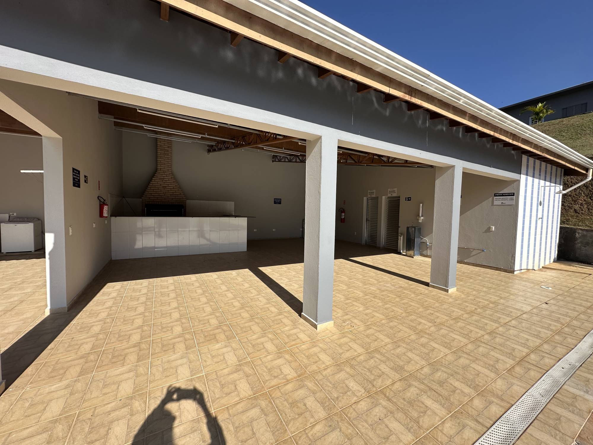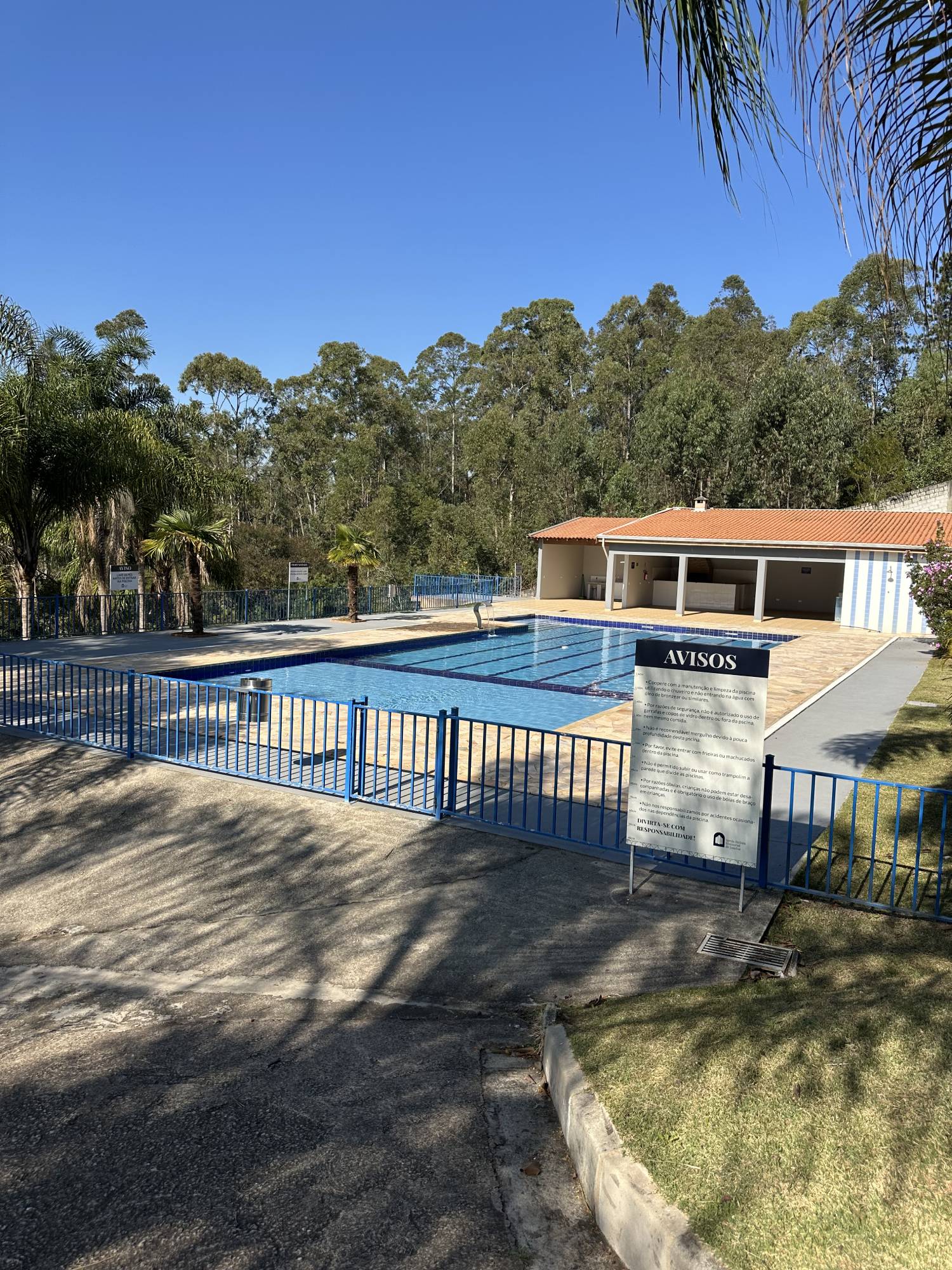 Piscina contendo as dimensões de 20m de comprimento x 8m de largura, sendo dividida: área das crianças 5m de comprimento x 8m de largura x 0,80m de profundidade e área adulto 15m comprimento x 8m de largura x 1,30m de profundidade. Este espaço contém ampla varanda com churrasqueira e vestiários feminino e masculino.